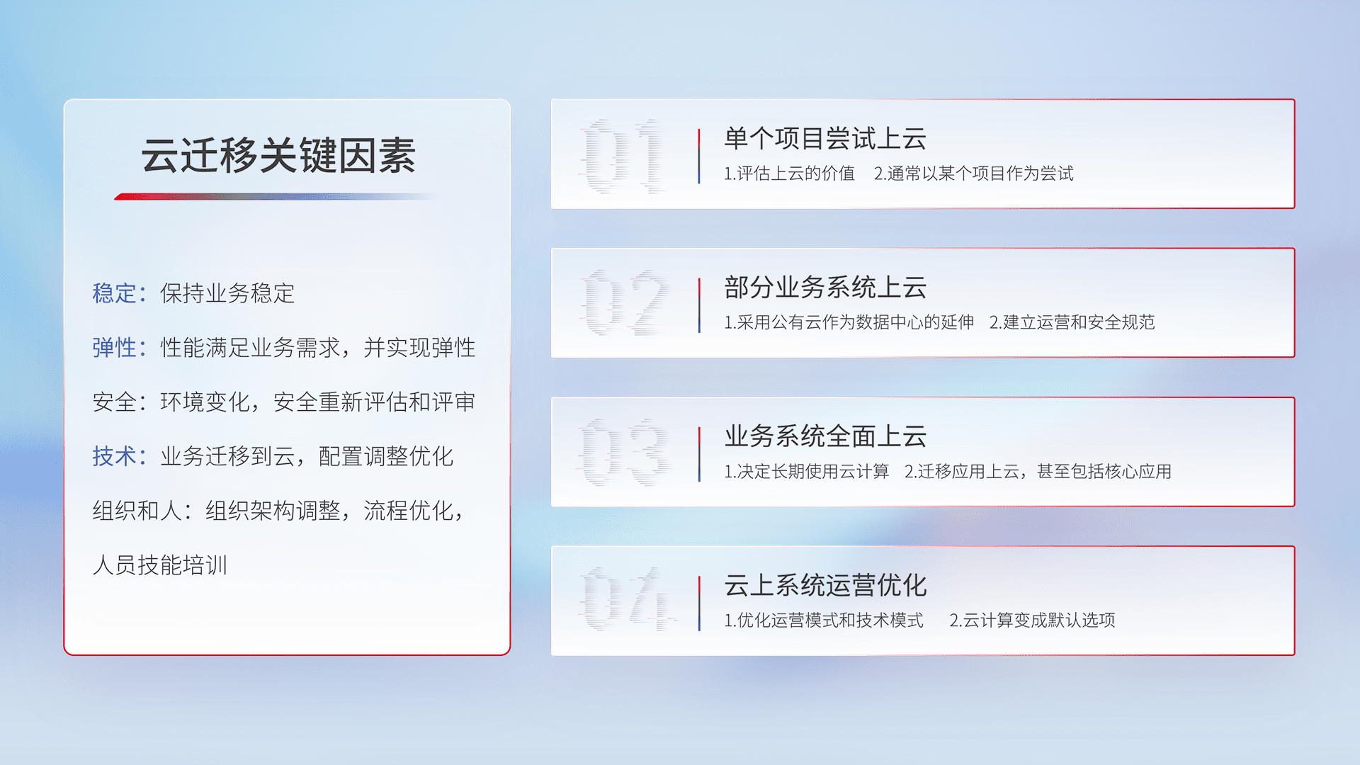 结合实际业务,,,从规划设计、、云平台选型、、、云原生改造、、、数据迁移、、、集成交付,,,,迁移全过程为客户识别最佳上云路径,,做好风险识别管理,,,设计网络架构、、身份权限、、、、安全审计合规、、、、操作审计、、、、日志审计、、、监控告警策略、、、、多站点容灾设计等,,,,对云上基础设施进行整体规划,,,,提升IT治理水平,,,,以满足弹性、、、、高可用、、、、高性能的需求。。