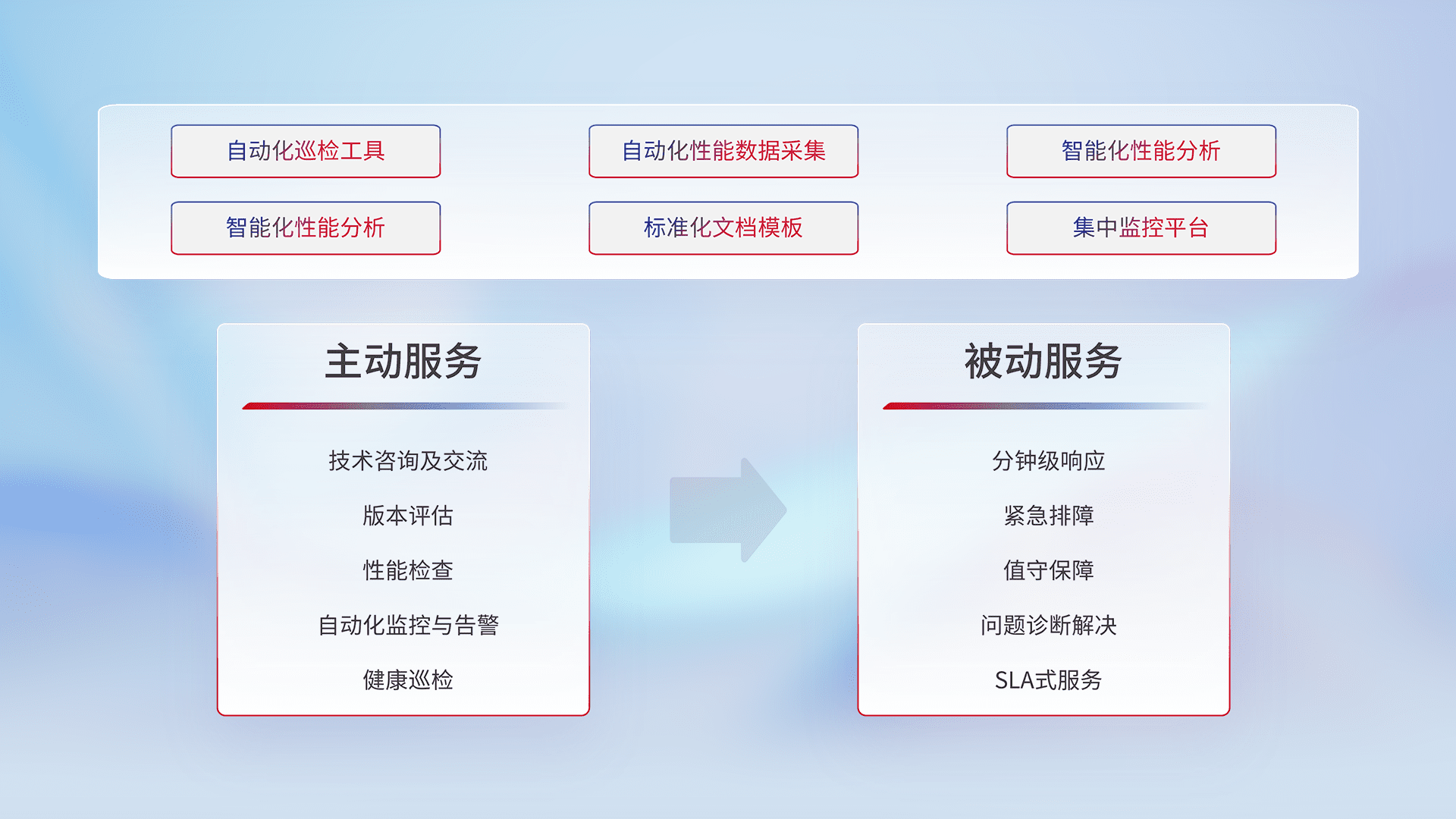 智能化工具和标准化文档,,,,保障服务质量,,提供主动服务(包含技术咨询、、、、版本评估、、、性能检查、、自动化监控与告警、、、、健康巡检)和被动服务包含(分钟级响应、、紧急排障、、、、值守保障、、、、问题诊断解决、、SLA服务)。。。